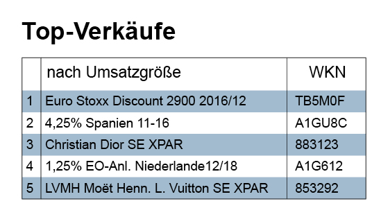 Die Liste der Topverkäufe führt – bezogen auf das Volumen – ein Discount-Zertifikat auf den EuroStoxx 50 (TB5M0F) an. Mit einem Betrag von fast 1,15 Mio. Euro handelte es sich bei dieser Veräußerung um die größte Transaktion der Berichtswoche; sie wurde zugleich mit Gewinn abgeschlossen. Mit einem erheblichen Minus endete hingegen das Investment in eine mit 4,25% verzinste spanische Staatsanleihe, die bis 31.10.2016 lief. Seit Sommer 2014, als der Kurs bei 108,5 lag, bewegte sich dieser zielgenau und seit Sommer 2015 fast ohne „zittern“ auf einer Geraden dem Nenn- bzw. Endwert entgegen. In eine ganz andere Richtung, nämlich nach oben, bewegte sich in den letzten Monaten der Kurs der Aktie des französischen Luxusgüter-Konzerns Christian Dior. Seit dem Tief im Sommer (27.6.) dieses Jahres mit 138,15 befindet sich die Aktie wieder im Steigflug und derzeit auf einer Höhe von über 176 Euro. Vielleicht bekam eine Vermögensverwaltung ein wenig Höhenangst – obwohl man das bei der Nähe der Geschäftsräume dieses Hauses zu den Bergen gar nicht glauben möchte. Wie auch immer, jedenfalls gaben die Entscheider dieser Verwaltung Aktien von Christian Dior ab. Der Lohn dafür war der höchste absolute und relative Gewinn aller Verkäufe der Berichtswoche.