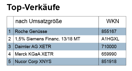 Der Verkaufsumsatz beschränkte sich ganz auf Aktien und Anleihen; auf der diesbezüglichen Liste standen keine Fonds und auch keine Derivate. Aktienverkäufe summierten sich auf 2,66 Mio. Euro, Anleihen steuerten knapp 0,7 Mio. Euro zum Verkaufsumsatz bei. Bei den Aktienverkäufen standen ganz oben (diesmal die ersten 10): Roche; Daimler; Merck; Nucor; Fresenius; Lyondellbasell; BASF; Commerzbank; WH Smith; Münchener Rück. Also immerhin ein halbes Dutzend Dax-Mitglieder. Und darunter ausgesprochene Analystenfavoriten, wie etwa Roche oder Fresenius.